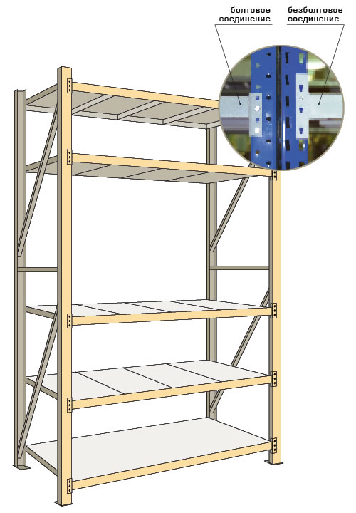 Среднегрузовой полочный стеллаж состоит из вертикальных рам-стоек, балок и горизонтальных полок.